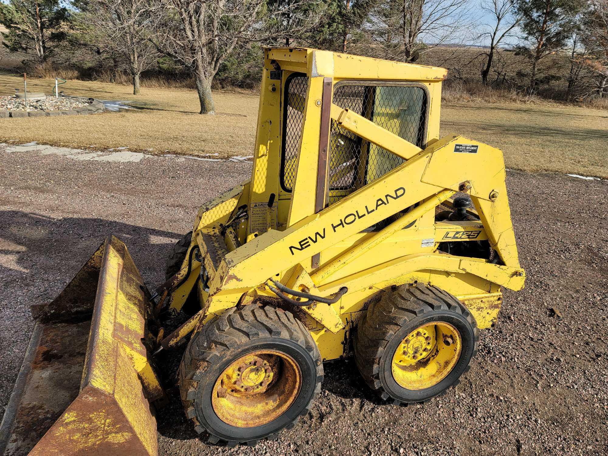New Holland L425 skid loader: Wisconsin gas engine, 60″ quick tach bucket, also comes with extra manure bucket, shows 1217hrs., New battery, New spark plugs, 27×10.5-15 tires at 50%, no cracks in tires, some new hoses, right lift cylinder leaks, stored inside, runs good, has not been used in last 5 years.