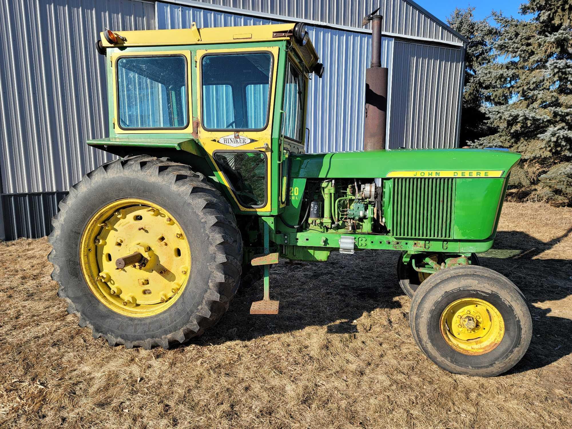 1971 John Deere 4320 tractor: Hiniker cab with heat, (blower motor went out), hour meter shows 0640 hrs. new water pump, side console, 2 hyd., 3pt, 10-16 front tires, 18.4-38 rear tires, back glass is cracked, tractor runs nice! (original paint on hood) ser# 008517.