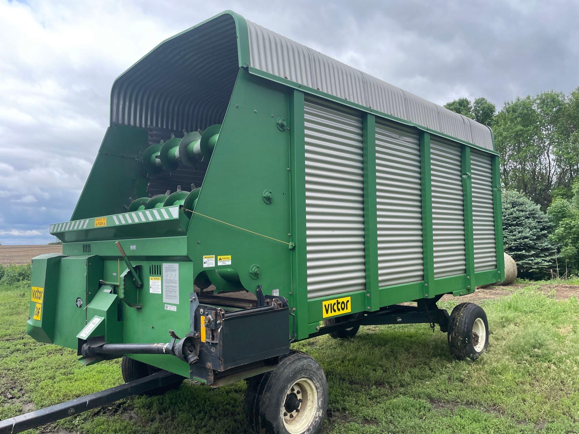 Silage Wagons: 2—Victor Model 20F 18ft Front Unload Silage Wagons—16ft wagon, 2ft unload auger, 18ft total, 12 ton gear, 540 pto, wood floor, roofs: 2—Badger 16ft front unload silage wagons—8 bolt 12 ton Demco gear, 12.5L-16 tires, roofs, 540 pto: 12ft steel Roorda rear unload silage wagon—6 bolt Westendorf gear: