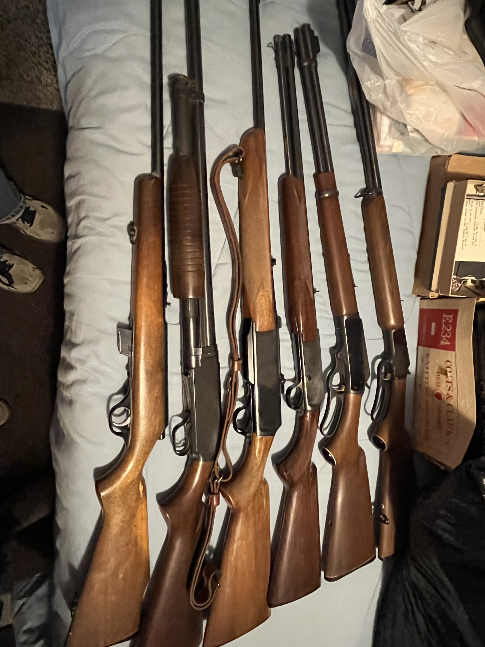 Guns: Browning 30-06 semi-auto rifle; Marlin Model 336 30-30 lever action; Marlin 22 lever action; Browning semi-auto 22; Winchester Model 12 ga shotgun; Glenfield 22 rifle, bolt action; British .303cal. rifle; gun cabinet; shotgun and rifle ammunition.