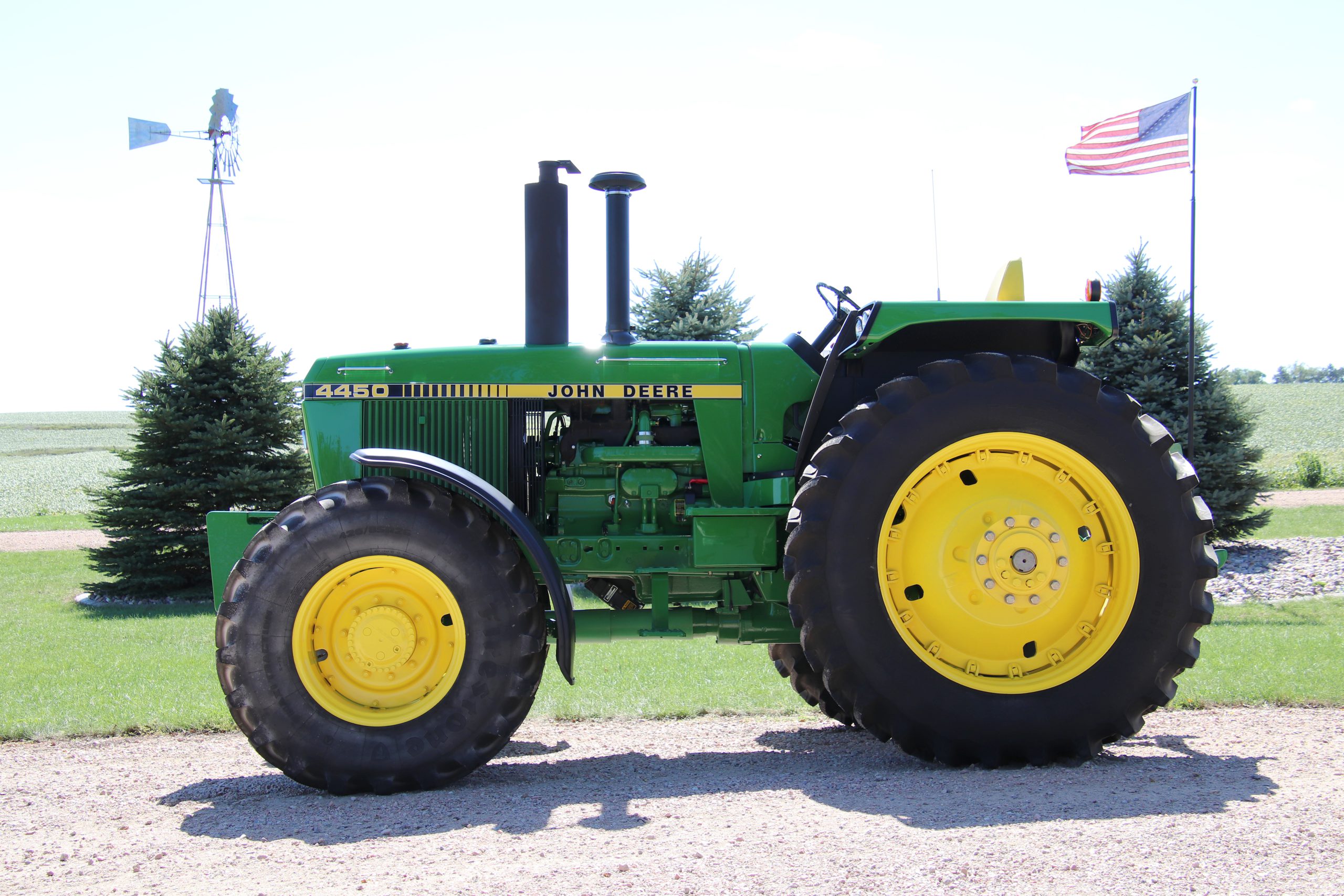 1987 John Deere 4450P, SN: RW4450P024583, open-station fenders, powershift, 8,478 hours, 18.4-R42 Firestone rear tires, 420/85/26 front tires, cast quick hitch, hammer strap, HD offset 42’’ cast wheels, 10 bolt dual hubs, vintage oil and fuel filters, toolbox, front fenders, driveshaft shield, 14 front weights (aluminum to save weight), front weight bracket extensions, floor mat, JD fender radio, battery tender.