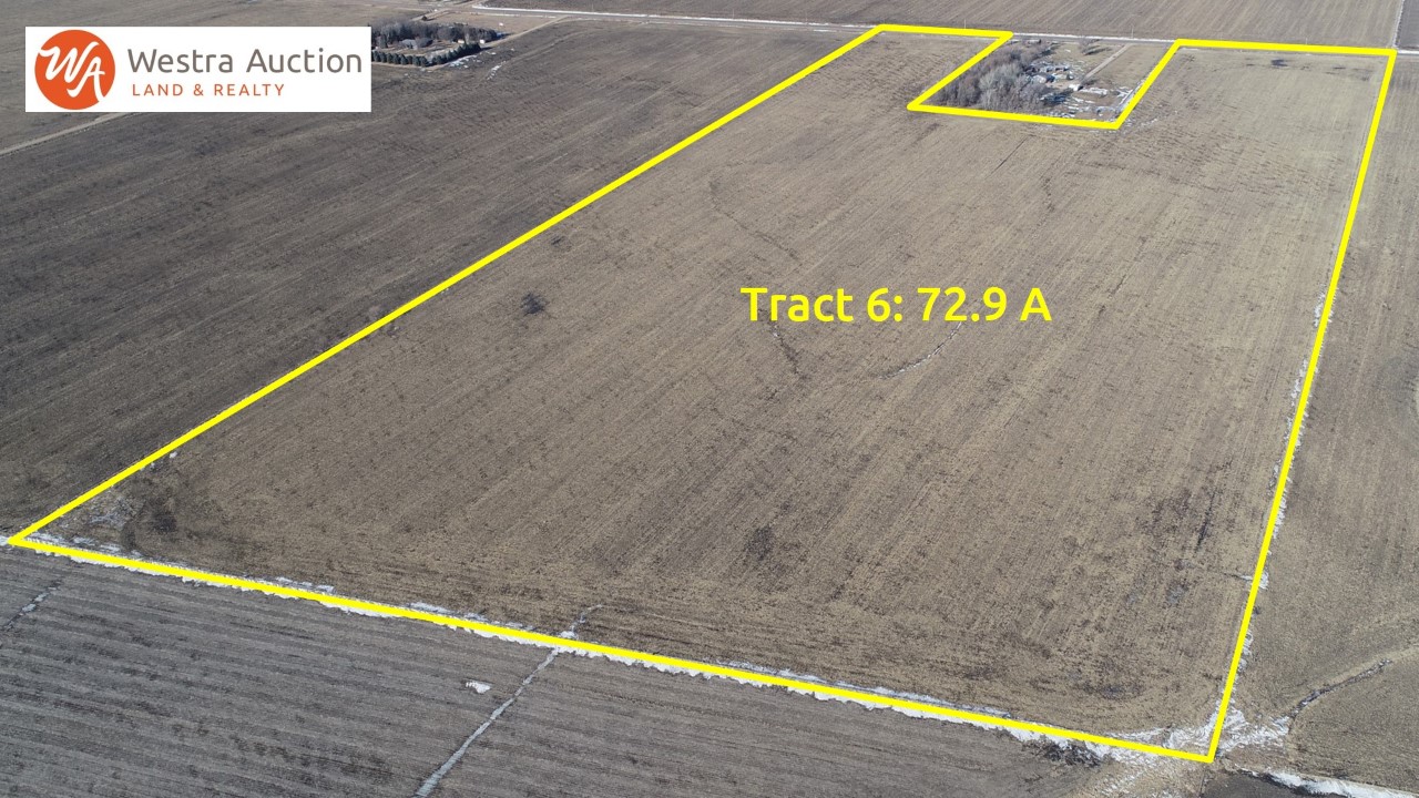 Tract #1 79.55 acres: W ½ SW ¼ 15-98-52, Turner County, SD. Located in the northeast corner of the intersection of 461st Ave and 282nd St. The land includes some drain tile and a certified wetland determination. FSA estimates there is 80.64 acres of cropland with a 38.55 acre corn base, 157 bushel PLC yield and 38.55 acre soybean base, 44 bushel PLC yield. Soil rating: 0.863. According to Surety/Agridata the land has a productivity rating of 85.4, predominate soil is Wentworth-Chancellor-Wakonda silty clay loam, 0 to 2 percent slopes. Taxes $2,196.74. Includes two building eligibilities.