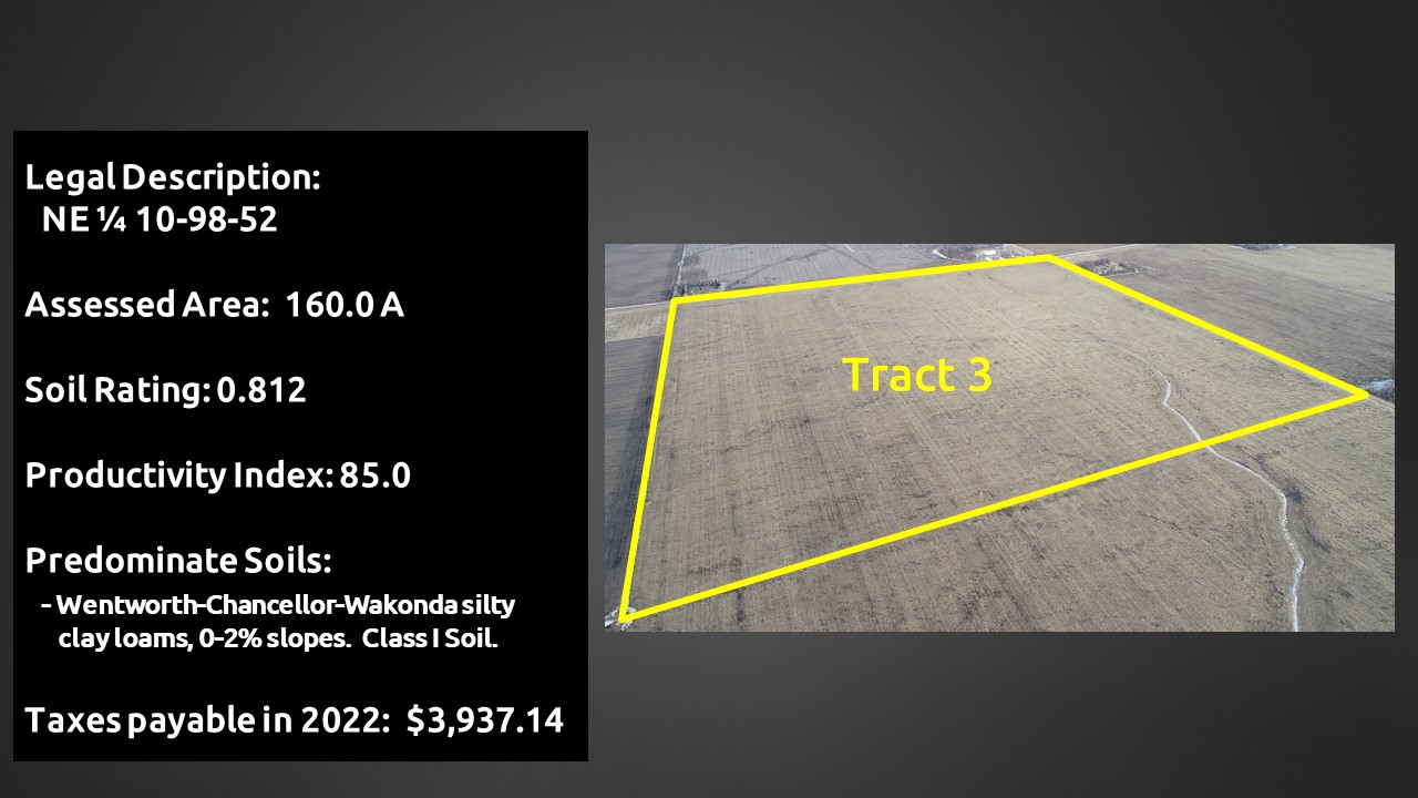 Tract #3 160 acres: NE ¼, 10-98-52, Turner County, SD. Located in the southwest corner of the intersection of 462nd Ave and 280th St. FSA estimates there is 161.17 acres of cropland with a 76.18 acre corn base, 160 bushel PLC yield and a 77.22 acre soybean base, 45 bushel PLC yield. Soil rating: 0.812. According to Surety/Agridata the land has a productivity rating of 85.0, predominate soil is Wentworth-Chancellor-Wakonda silty clay loam, 0 to 2 percent slopes. Taxes $3,937.14. Includes 4 building eligibilities.