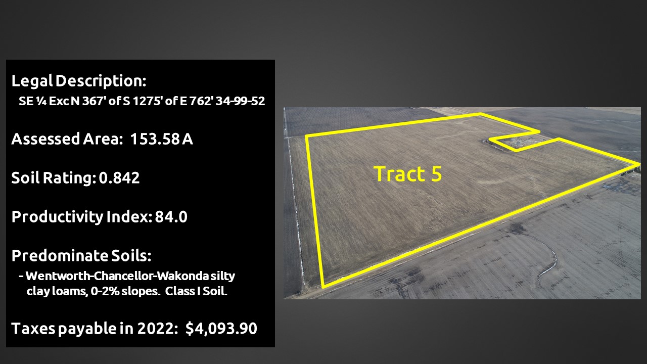 Tract #5 153.58 acres: SE ¼, Except N 367′ of S 1,273′ of E 762′, 34-99-52, Turner County, SD. Located in the northwest corner of the intersection of 462nd Ave and 279th St. FSA estimates there is 150.65 acres of cropland with a 72 acre corn base, 157 bushel PLC yield and a 72 acre soybean base, 44 bushel PLC yield. Soil rating: 0.842. According to Surety/Agridata the land has a productivity rating of 84.0, predominate soil is Wentworth-Chancellor-Wakonda silty clay loam 0-2 percent slopes. Taxes $4,093.90. Includes 3 building eligibilities.